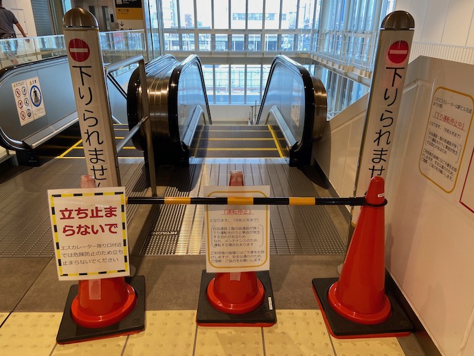 ちなみに大きな荷物を持った乗客は、階段を使い上り下りするしかない。上りのエスカレーターを使おうとすれば、左手の入り口に大きく遠回りするしかないのだが、これもフェンスで塞がれている。