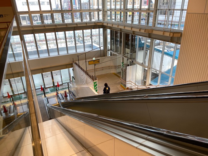 上から眺めてみると一目瞭然なのだが、エスカレーター下の通路の幅が狭すぎるのだ。吹き抜けのガラス壁をあと2−3m向こう側に広げて、左右からくる乗客の通行動線を確保するべきなのだろう。設計ミスとしか思えない。駅前ロータリーの整備工事もしているが、それが完了してから外壁移動をするのかもしれないが、対応があまりに杜撰だ。