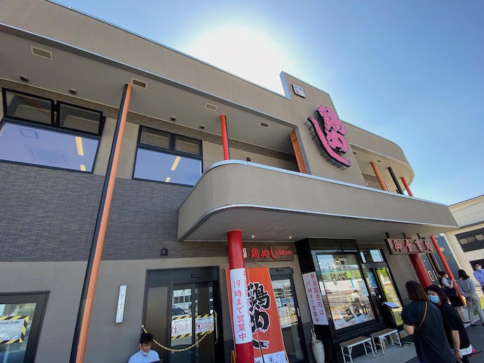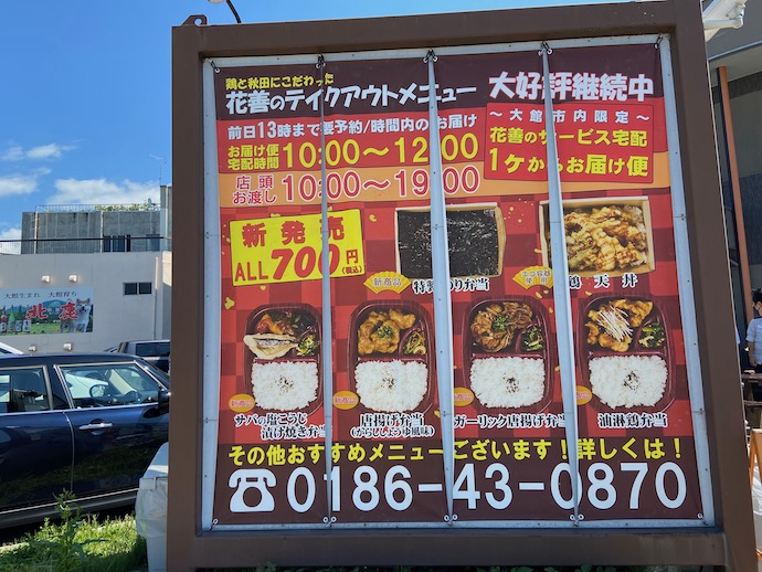 その大館駅前に、駅より立派な建物があった。自分の中の駅弁ランキング、おそらくダントツ筆頭の「鶏めし」製造元、花膳の食堂だ。昼食時から少し遅くなっていたが、店頭では席待ちの客が行列していた。