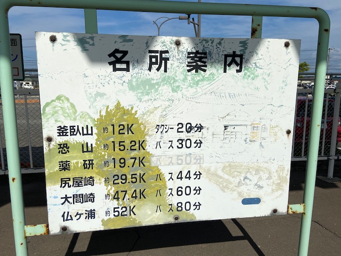 案内板を見ると、レンタルの自転車で回れる距離でもなさそうだ。端っこ好きとしては大間崎がちょっと魅力的だった。ただ、このバス60分の距離は、おそらく日帰りできない。朝イチのバスで行ったら滞在時間10分で最終バスになりそうだ。これもよくよくバス時刻と運行パターンを調べておかないと、手を出してはいけない冒険旅行になってしまう。