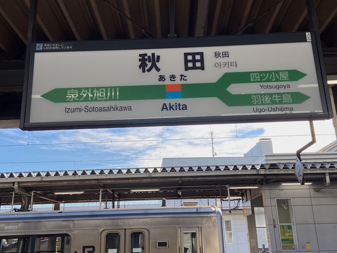 秋田駅は青森、盛岡、新潟を結ぶ結節点なので駅の規模は大きい。駅名表示も全て緑色でJR王国だ。各駅停車の旅では、乗り継ぎポイントとして重要な駅になる。