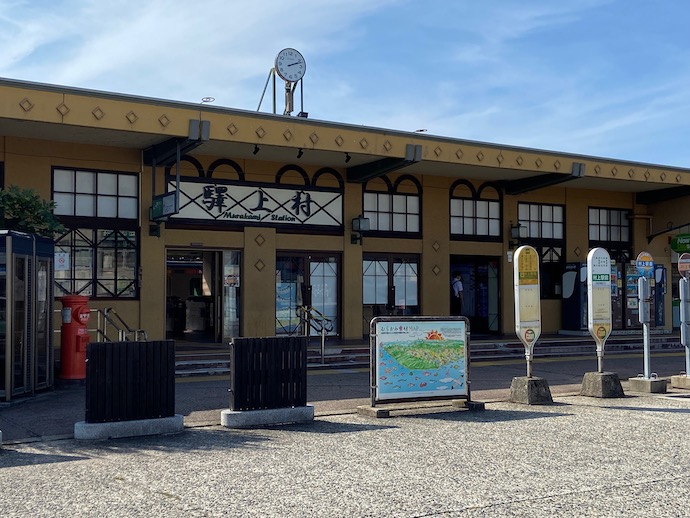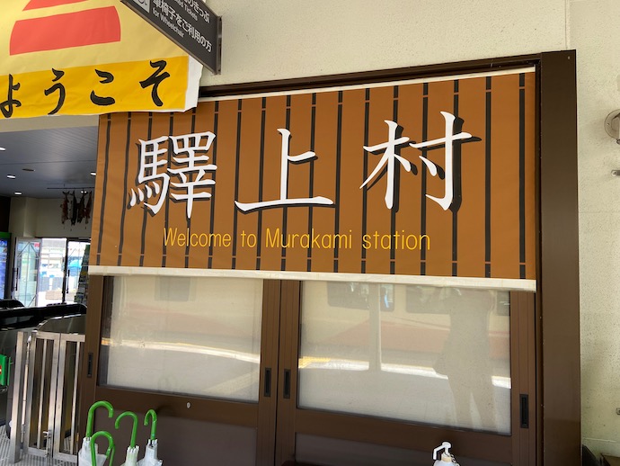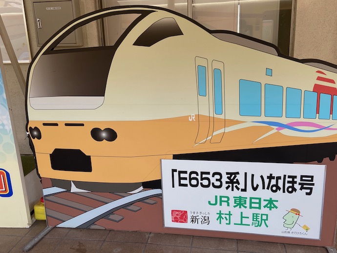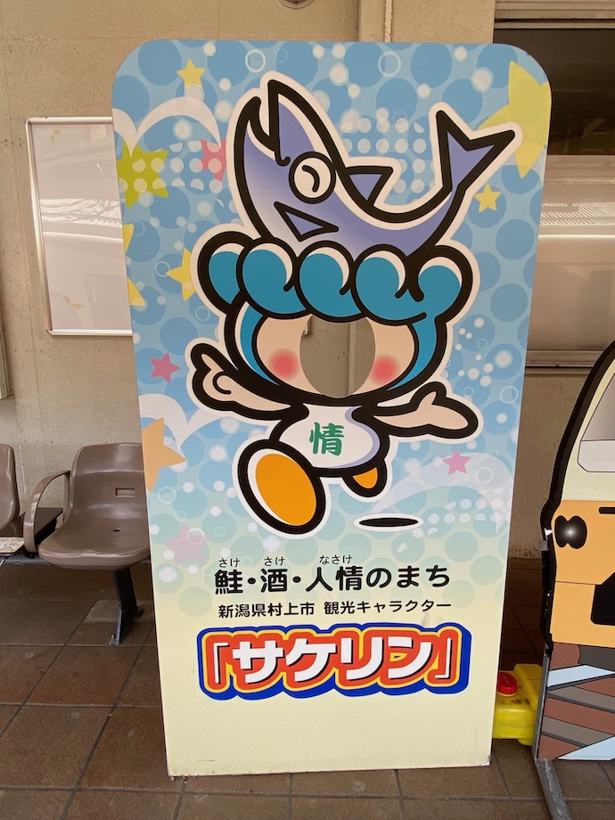 村上は鮭の町と思い込んでいたが、お城の街でもあったようだ。戦国時代には出羽の最上氏がブイブイと言っていた勢力圏だった。やはり駅には「鮭」キャラがいた。