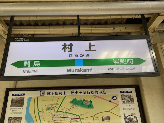 酒田で2時間以上の待ち時間があり、あれこれ旅程の再検討をしていたら特急を使い、いわゆる「ワープ」をすると早めに新潟につけることがわかったので、ここはズルをして特急「いなほ」で飛ばすことにした。着いたのは「村上」、これで秋田県から山形県を抜け新潟県に入った事になる。