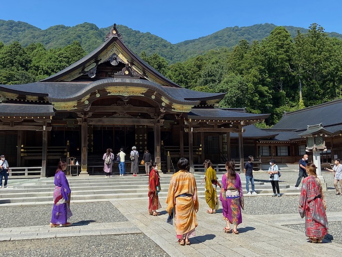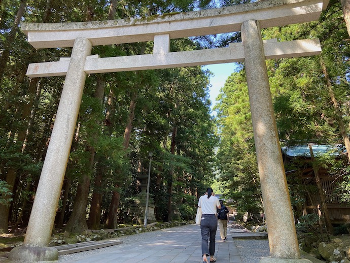 駅から神社まではかなり歩く。この日の気温は30度を超えていた。おまけに神社まではダラダラ続く登り道で、ほとんど苦行と言いたい。確かに神社に車で乗り付けるのが現代風というものだろう。ヒイヒイ言いながら坂道を登っていくと、神社の近くにはホテルや旅館が密集していた。なるほど、車で来てお参りをしたあと、ここに泊まれば良いのだと納得した。長野善光寺門前の宿坊みたいなものか。