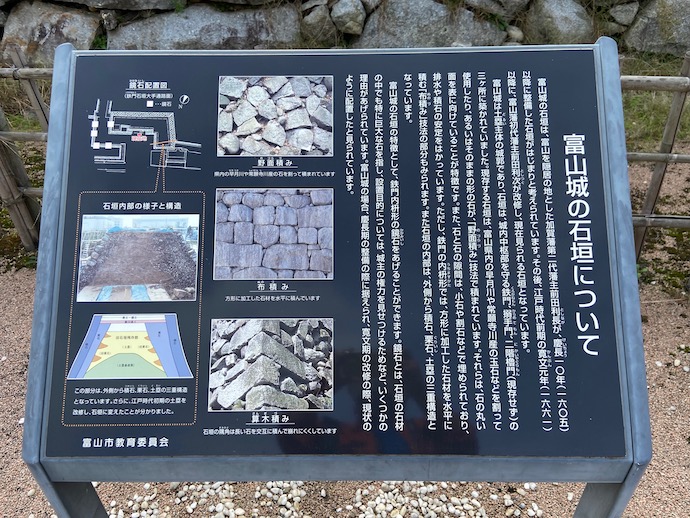 富山城石垣には人の背丈を超える巨石もいくつか使われていた。築城当時の城主が金持ちだったのだろうな、と別の部分にも感心した。端正に形を揃えた石が積まれている積み木細工のような城壁は建築美の極みと言って良いだろう。