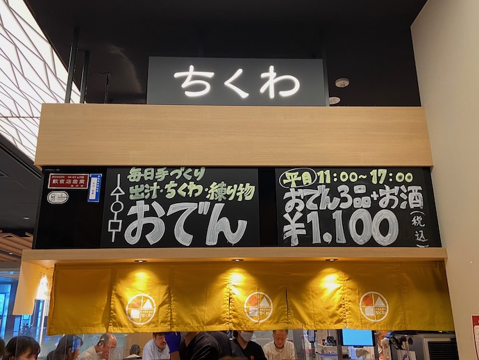 駅ナカの飲食店が固まっているところに、おでんのカウンターがあった。金沢おでんは、知る人ぞ知る金沢名物だと思うが、すごいなと思ったのがおでんの1100円セットだった。おでん3品と酒付きのセットがランチタイム限定で販売中になっている。