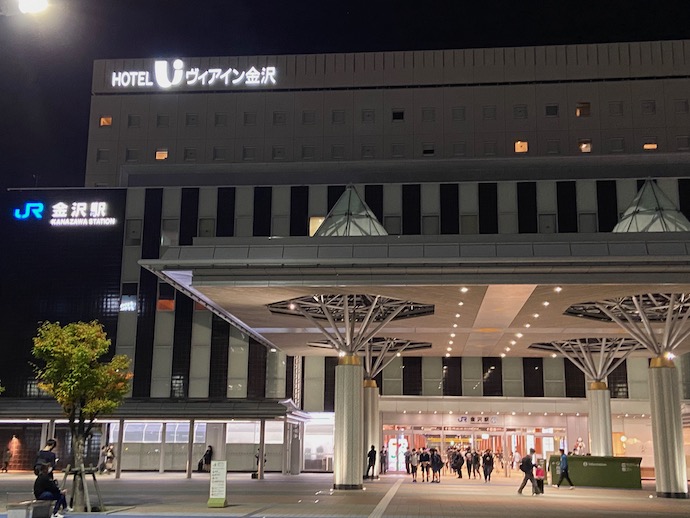 金沢駅の西側は、すっかり整備工事も終わっていてオフィス+ホテル街に変貌していた。駅前に大きな屋根がかかっているのは、やはり冬の雪対策なのだろう。東側の入口とは全く趣が異なる現代風なデザインで、ここは東京駅とか大阪駅と言われてもデザイン的な違和感はない。