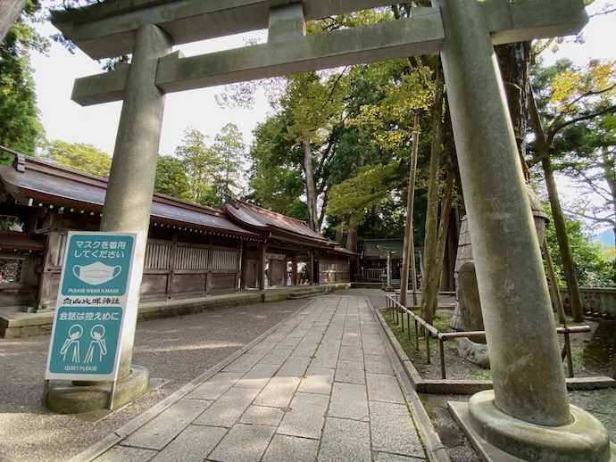 神社の名前は難しい。「しらやまひめじんじゃ」 と読むのだそうだ。主祭神が白山比咩大神なので、日本海沿岸に広がる大国主系とは別系統の「越国」神社だ。調べてみると菊理媛尊(くくりひめのみこと)とも呼ばれるようだ。高天原神族の中では古手の神なので、やはり越の国でも大物の神様だったのだろう。