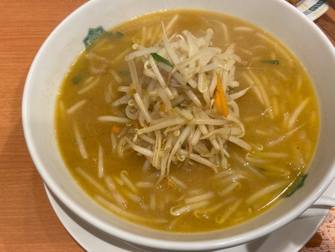 この店の味噌ラーメンはシンプルにもほどがあると言いたいくらい、トッピングが少ない。炒めもやし、That’s all !!という潔さなのだ。お値段が味噌ラーメンとしては破格にお安いので仕方がないが、メニューには味噌チャーシューメンとか味噌スタミナ麺などというアップグレード版はない。