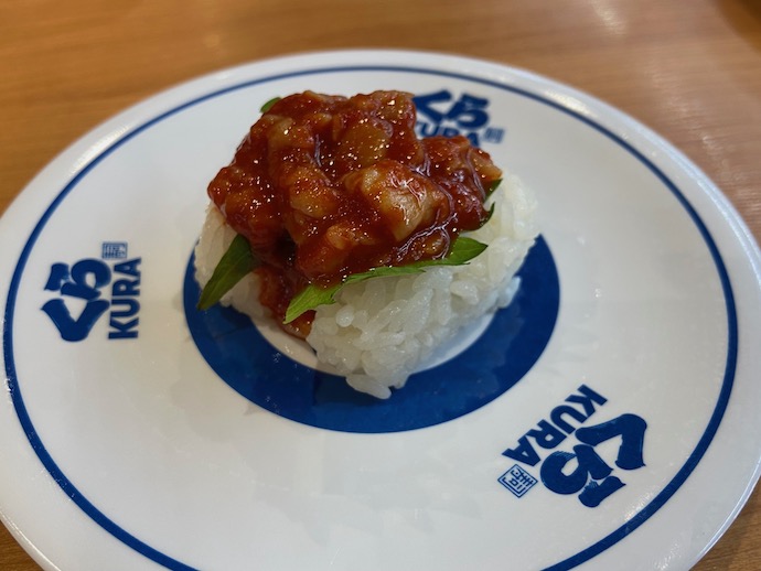 回転寿司の軍艦が好きで、特にトッピングが代変わっているものを「お試しチャレンジ」と称してよく食べる。マヨコーンやツナが乗っている軍艦巻はもはや定番になってしまった。ハンバーグや牛カルビが乗っていて驚いたのは10年以上前だが、今ではイベリコ豚や炙り焼肉も定番になった。生ハムなど変わりメニューにもならない。