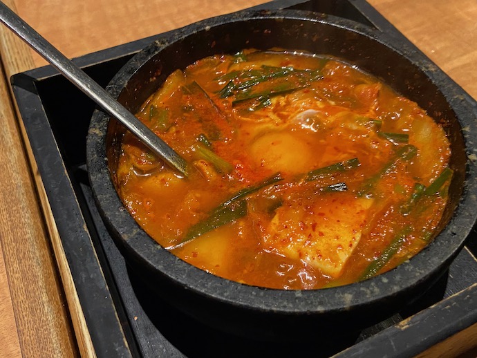 中にはキムチも入っているのだが、全体的には甘い味噌仕立てという感じで、これが予想をはるかに超えていてうまい。自分で作ってもできそうな気がする。冷蔵庫に入っている豆腐と豚肉とキムチを石鍋で煮込む。野菜はニラや長ネギ、白菜など適当に投入する。味付けは中華鶏ガラスープと味噌で仕上がれば良さそうだ。甘さ強調のため黒砂糖を放り込むと一段と上手くなりそう。