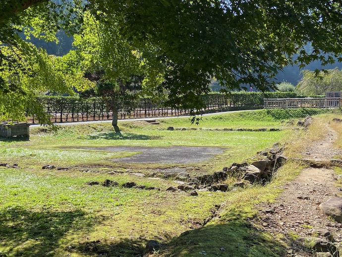土塀の外は、全部に武家屋敷が再現されているわけではない。野原のまま放置されているが、当時の区画や井戸(給水口)の跡がわかる。山際まで街が広がっているように見えるが、戦国時代から江戸時代は、里山がほぼ禿山になっていた。燃料として、伐採できるかぎり山の木は刈られていたので、当時の一乗谷は意外と解放感がある谷間だったのかもしれない。