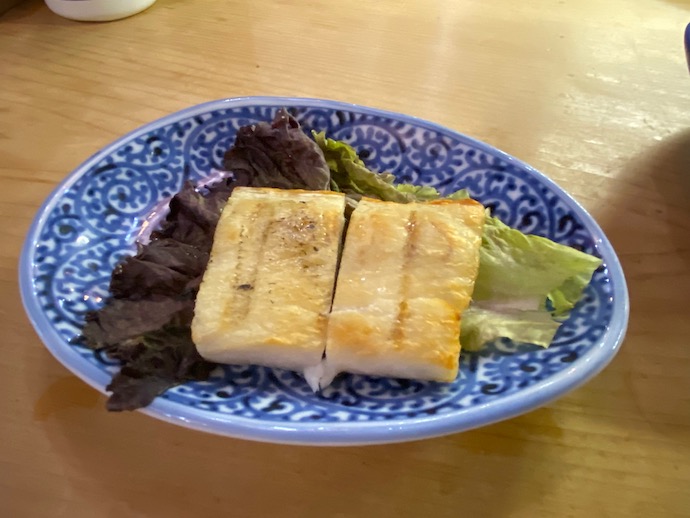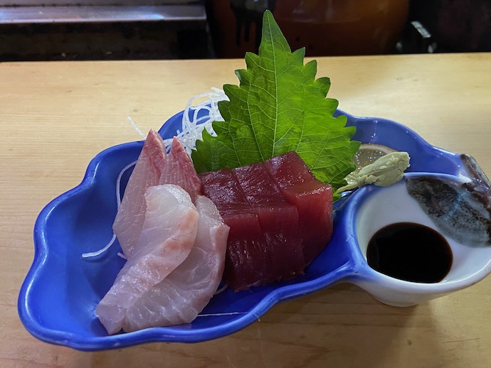 刺身の盛り合わせを頼むと、一人前にちょうど良い量が出てきた。マグロは「生」のようで、ねっとりとした歯触りがある。この日はカンパチ推しの日だったようで、いろいろなカンパチメニューがあった。その刺身を食べてみると、弾力のある歯応えがしっかりしたプリプリだった。名前だけ見れば全国どこでも食べられそうなものだが、これはこれでうまい。