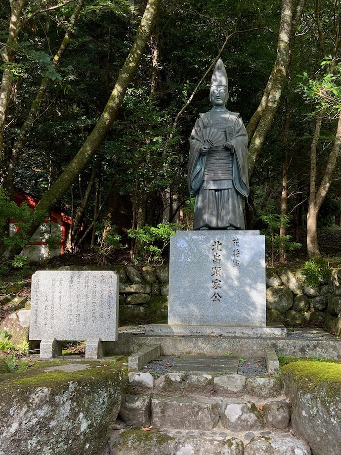 城は山の上にあったようで、麓には「北畠神社」があった。なかなか広い境内と、巨木があちこちにある由緒正しい神社のようだ。城巡りのついでにお参りしてきた。その境内の中に、一体の像があり、北畠氏をしのぶものだった。まさに中世武家貴族の代表的な姿に見える。