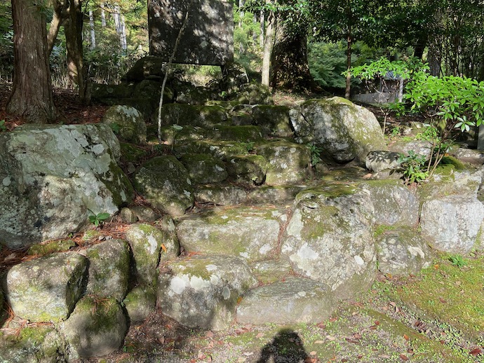 中世最古の石垣とはこのことだろうかと、神社で見つけた石積みを眺めてみた。築城術に詳しいわけではないが、確かに石の積み方が素人目に見ても適当すぎる、というか洗練されていない。だいたい段差のある石積みだと、敵兵が簡単に登って上がれるわけで、防壁としての意味合いは低くなる。木で作った柵よりはマシという程度ではないか。
