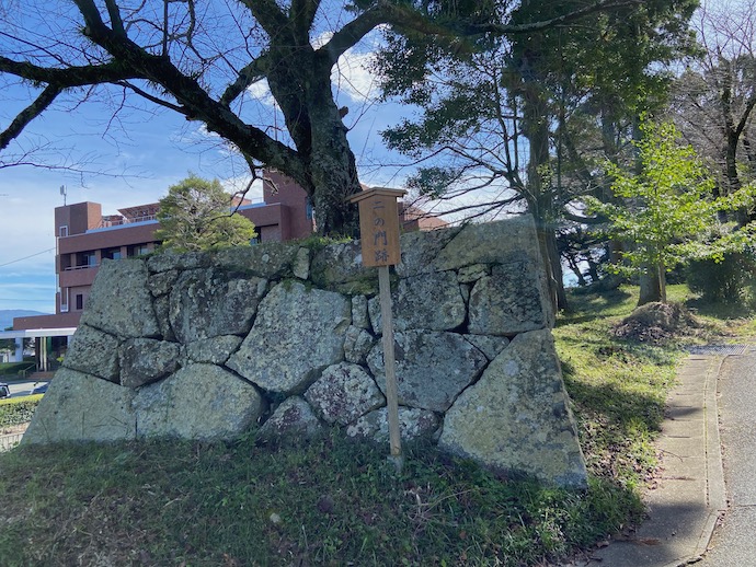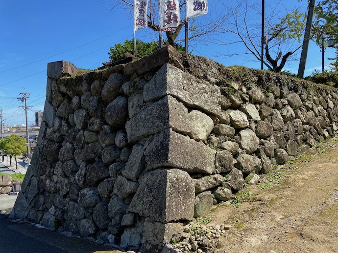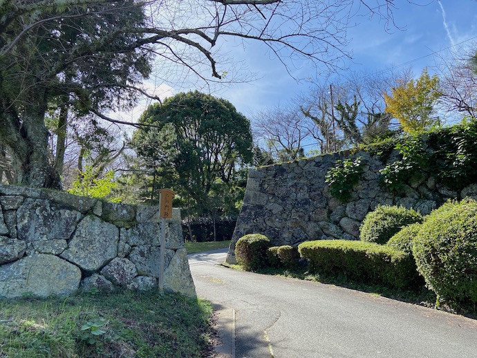 石垣は、それなりに大きな石を使ったものだった。今は石垣の上に建造物がないから、単なる低い塀にしか見えないが、当時はこの上に矢間を備えた防御壁が立っていたはずだ。曲がりくねった石垣の間を通ろうとすると前後左右から矢を射かけられる。計算尽くされた構造なのだが、今では車で通るときに、大型車だと面倒な切り返しも必要になるクランク道路だ。時代によって道の意味も変わる。