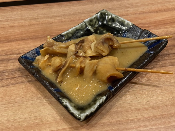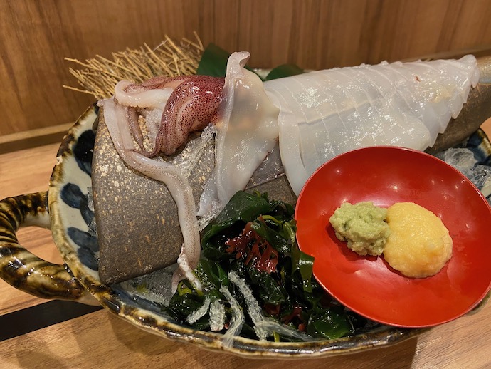 次に本日のおすすめと書いてあった、イカのお造りを頼んでみた。(ちなみに西ではお造り、東では刺し盛りと呼び方が変わるようだ)琵琶湖でイカが釣れるはずもないから、おそらく北陸からくるのだろう。ひょっとすると大阪湾からかもしれない。海のない滋賀県で、海産物を食べるというのもこれまた奇妙なものだが、現地で暮らす人にとっては普通の注文だろう。