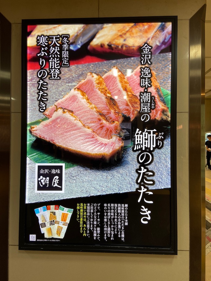 金沢駅で土産物を探していたら、目に飛び込んできた看板だが、思わず何度も読み返してしまった。「ブリのたたき」と書いてある。「タタキ」といえば、まず思い浮かべるのは「カツオ」であり、その高級品は藁で焼いている。焦げ目がびっしりついた鰹のたたきは大好物だ。