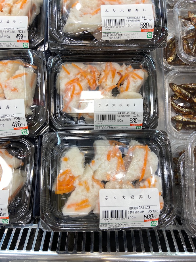 そんなことを考えながらスーパーの魚屋を覗いていたら、これまでみたことのない「ぶり大根」を発見した。ぶり大根寿しと書いてあるから、糀で漬け込んだ甘酸っぱい食べ物だと想像がつく。これの方が、北陸伝統食という気もする。金沢からもう少し北に行けば、鰤と鮭の食文化境界線になり、新潟にいくと、このブリ大根も「さけ大根」が主力に変わるだろう。