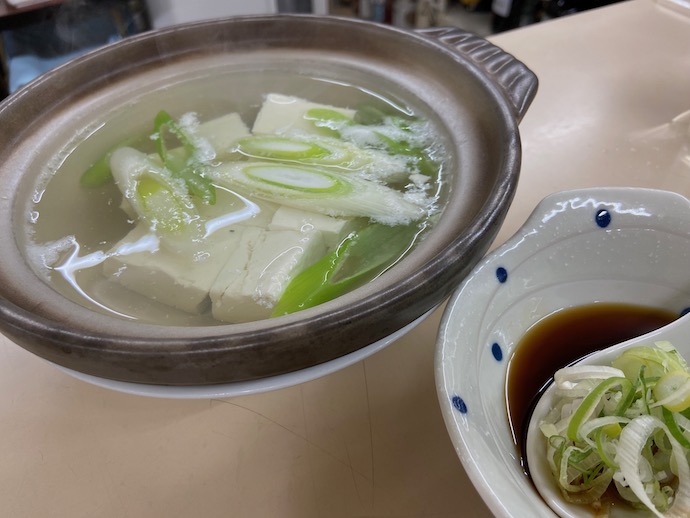 湯豆腐は典型的な一人鍋だと思うが、これはシェアして食べてはいけないと思う。昆布出汁が出た「お湯」を最後に付けつゆで割って飲むために、一人で独占したくなる。湯豆腐を食べながら次の注文をすると、食べ終わる頃にちょうどのタイミングで出てくる。その辺りの呼吸が、居酒屋飲みの楽しみでもあるかな。