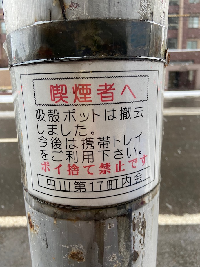 などなど、色々なことを思い出してしまった「喫煙者」へという警告状だった。すごいな円山の町内会。ちなみに、この辺りは高級マンションが立ち並ぶ上級市民のエリアだからかもしれない。ポイ捨ては不法行為だから、やめましょう。