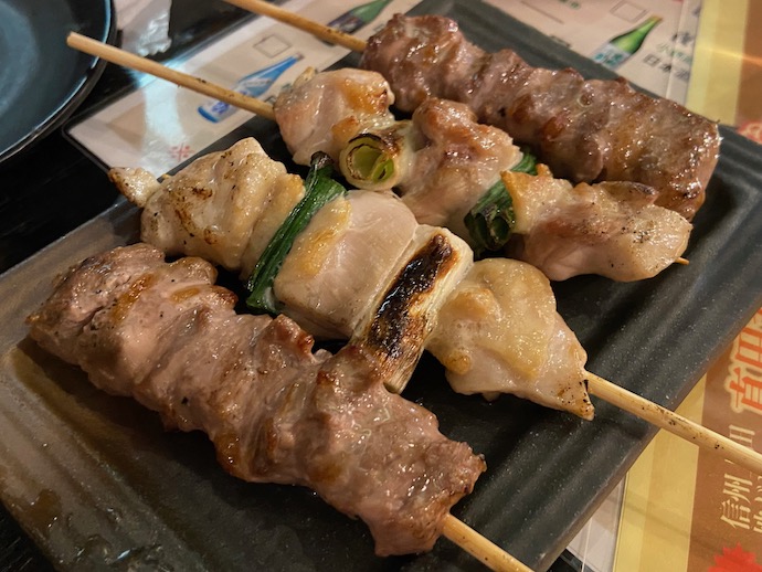 焼き鳥は信州上田スタイルなので、何もしないままの焼き鳥が出てくる。これを「ツケだれ」「かけだれ」の好きな方で調整して食べる。つけだれは、串揚げをソースにつけるように、カップに入った「タレ」の中に、串を持ってドブンとつける。肉にタレがたっぷり絡まる。