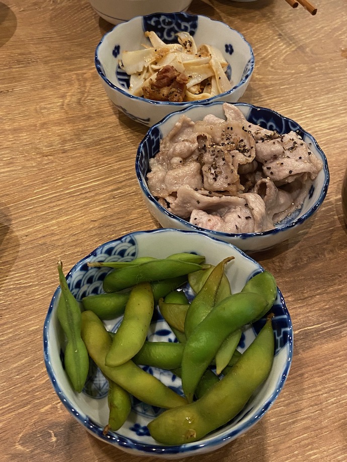 料理は小鉢を色々取り揃えている感じで、お値段はどれも低めだった。小皿料理というよりお手軽なつまみがたくさんという感じだ。居酒屋の定番というメニューも多くあるが、ちょっと変わった気になる「アイデア・メニュー」もある。今回気になった変わりメニューは枝豆の燻製で、スモーキーな香りがついた枝豆というのは、Good Jobと言いたくなる。