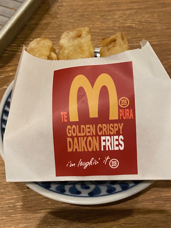 その安い揚げたて天ぷらを楽しんだ後に、全く別の意味で楽しんだのが、大根の唐揚げだった。おそらくおでんの大根のように、出汁で一度煮込んだものを、衣をつけカリッと揚げたのだと思う。これはこれで、とてもおいしい。素晴らしい料理アイデアだが、それ以上に楽しんだのはこの袋で、とてもとても楽しく笑わせてもらった。