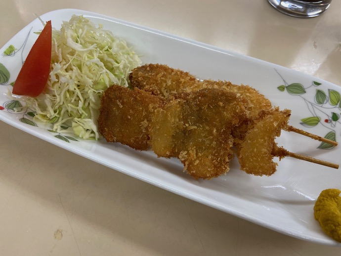 その昼飲みの店で串カツを頼むことが多い。居酒屋メニューとしては絶滅危惧種だろう。トンカツ屋でも串カツがメニューにない店の方が多いような気がする。串カツの中身は、油身の多い豚肉と玉ねぎが定番だと思うのだが、あまり肉が大きいのは好みではない。肉2に対して玉ねぎ3くらいのチープ系串カツが好みで、大学時代の学生食堂で食べていた名残というか、刷り込みされた「擬似うまいもの体験」であると自己分析している。