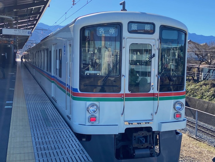 昔懐かしの西武鉄道カラーでいまだに走っている西武鉄道秩父線の電車だが、池袋始発の直行ではなく、西武池袋線飯能駅で乗り換える。池袋から飯能駅まで急行で1時間程度。降りたホームの反対側に待っているのが、このライオンズカラー列車だ。