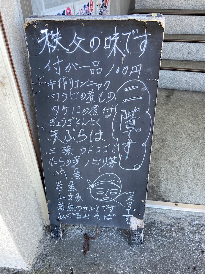 西武秩父駅前にある食堂がとても気になっている。今回は別の店に行くつもりで秩父に来たので、次回に行く予定なのだが、とりあえず店の前まで下見に行ってみた。店頭の黒板は実に味がある。メニューもうまそうだ。山菜天ぷら食べてみたい。そして、マスターの実物にもお目にかかりたい。