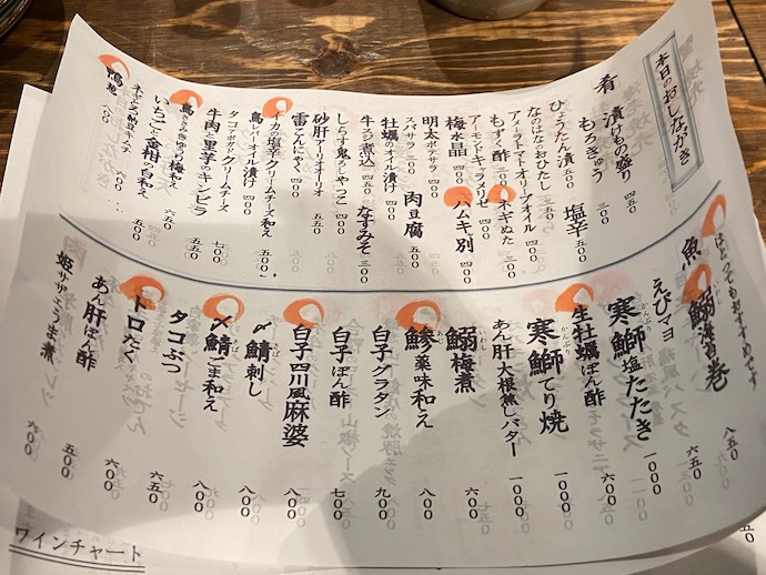 カウンターの前には、白い紙に印刷されたメニューが丸めてコップの中に入っていた。おもむろに取り出してあれこれ注文の品定めをする。The 居酒屋定番というメニューが並ぶ中、オヤっと思う新しめな名前もある。クリームチーズやらアーリオオーリオやらキャラメリーゼやら、カタカナが混ざるメニューになっているのは令和の証だろうか。お値段も昭和価格から令和価格(最新版)になっているのは仕方がない。