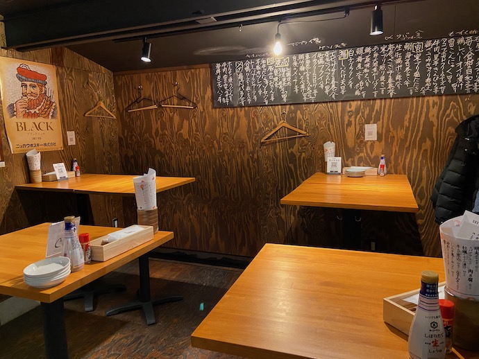 店内は、さすがに新店だけあって綺麗なものだ。タバコの煙もないから、店内が煤けて風格が出ていくのにも時間がかかるだろう。あちこちの店で消えていたテーブル上のあれこれ(箸立てや調味料など)もすっかり置かれるようになった。