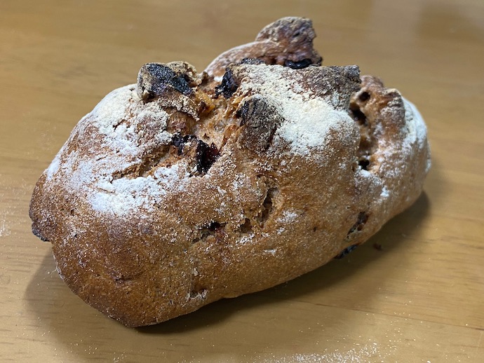 味が濃いので何もつけずに食べるが、歯応えが強く何度も噛み締める。パンの味というのはこういうものかなと感じる。口の中の水分を全部持っていかれるというか、吸い込まれてしまう。クルミや干し葡萄の味が良いアクセントになるのだが、食べ物を噛み締めるという「本能的な楽しさ」がある。