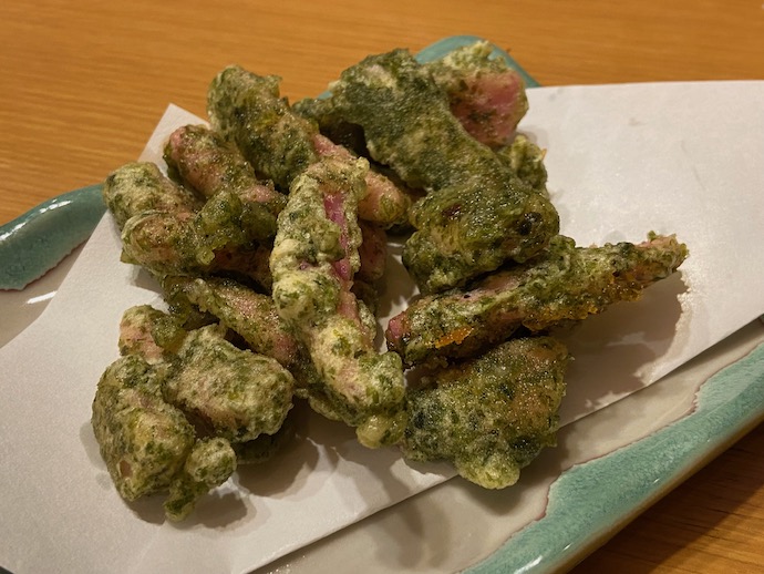 そして、この店の生姜の天ぷらだが、見た目は青のりが混じった衣のために、ちくわの磯辺揚げのようにも見える。一つ一つが小ぶりのサイズなので食べやすい。酒の肴としてはパーフェクトに近い仕上がりだ。量は少なめだが、この店のメニューは低単価低従量が標準なので文句はない。味は濃いめなので、このま何もつけずにつまむ。好みの味なので、次回もこれを頼むことになりそうだ。