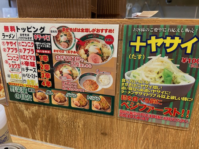 今回は初回なので、全部入れにしようかと思ったが、①③④⑥にしてみた。増量はなしだ。エビマヨは食べたことがないので最初に決めた。ベビースターは食感パリパリに重要だし、追加調味料としてニンニクと辛味は外せない。次回は、ヤサイマシマシにしてみようと思ったが、初回は普通盛りにしておいた。
