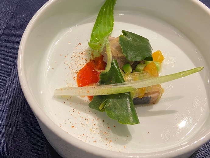カツオは、おやまあ、これがカツオですかという大変身をしていた。高知スタイルでのカツオのスタンダードな食べ方、つまりポン酢とニンニクとは大幅に違う。野菜としっかり併せて、口の中でのミックスを楽しむ料理になっていた。