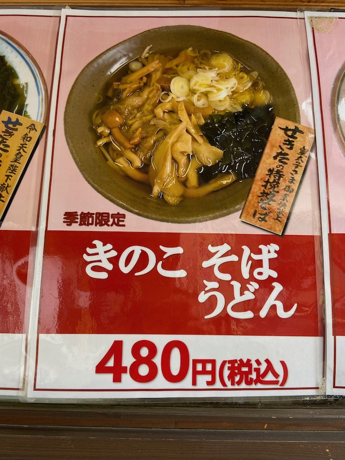 店名は、どうやら「秩父そば」らしい。この店の他にも店があるのかもしれない。メニューは駅そば店としては珍しくシンプルだ。ただし、今回のお目当てはきのこそばで、それもメニュー板を見ると季節限定とある。何も迷わずにきのこそばを注文したが、メニュー板をよくよく眺めてみると、これが一番高額な看板メニューだった。きのこそばは天ぷらそばより高いのだから、「きのこ」はトッピングとして偉いようだ。キング・オブ・トッピングというやつだ。