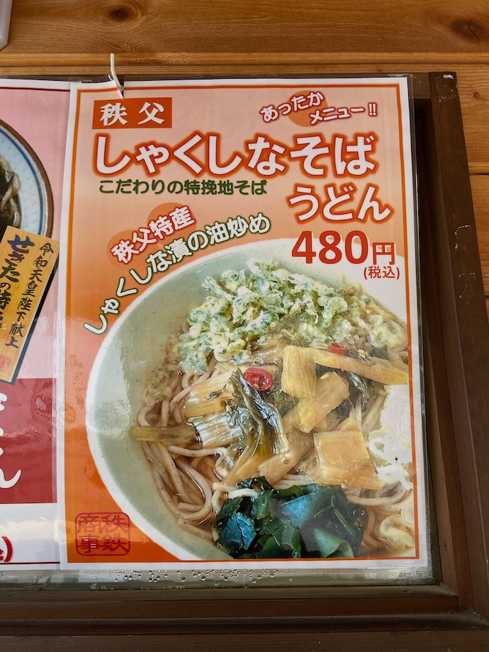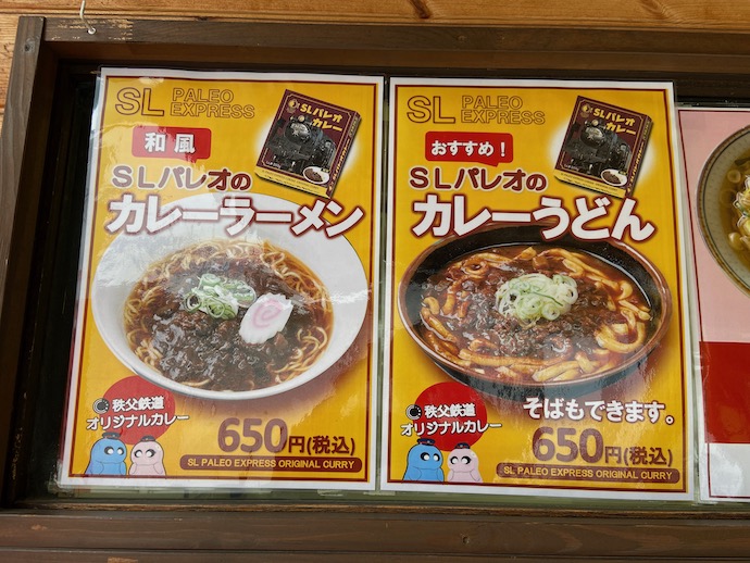 ただ、写真を撮っていて初めて気がついたのだが、キノコそばに匹敵する高額メニューがあった。「しゃくしなそば」だが、これは食べたかった。しゃくし菜漬けのうっすらとした酸味と蕎麦はよく合いそうだ。おまけに、これまた全く知らなかったのだが、SLパレオ号のカレーというものが存在するようで、それを使ったカレーラーメン、カレーうどんがある。なんと、こちらの方がキノコそばよりはるかにご当地蕎麦っぽいではないか。おまけにぶっちぎりの高額メニューだった。