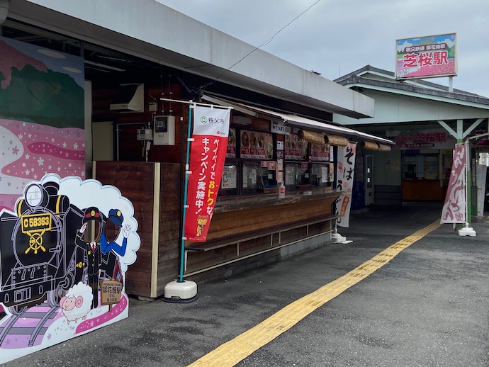 芝桜駅と書いてあるが、この駅は「御花畑」駅だ。芝桜の名所が近くにあるので、飾り看板としてかかっているのだろうし、愛称駅名だ。その駅舎の隣に立ち食い蕎麦屋がある。これも実に古典的な立地だ。