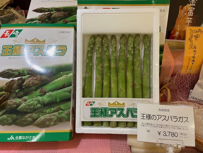 その味噌買い出しの時に気がついたのが極太アスパラで、贈答品のような立派なパッケージに入っていた。お値段も、家庭使いにはなりそうもない。一本あたり400円程度になるので、これはアスパラが主役の料理にするしかない。添え物・副菜としてはありえない高価格品だ。ちなみに、この野菜売り場の隣が鮮魚店なのだが、そこでは冷凍の魚が一匹4-500円で売られていた。冷凍カツオたたきでもワンパック500円くらいだった。