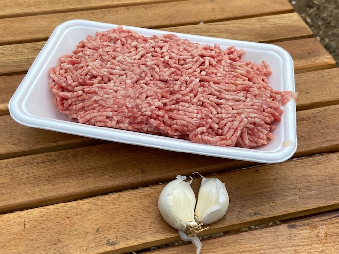 材料は挽肉とニンニクのみ。挽肉は豚でも牛でも良いのだろうが(そこはレシピーの確認をしていなかった)、今回は牛豚合挽きを使ってみた。肉の量は自分の腹具合に合わせて決めれば良い。今回は300g弱のパックを買ってきた。
