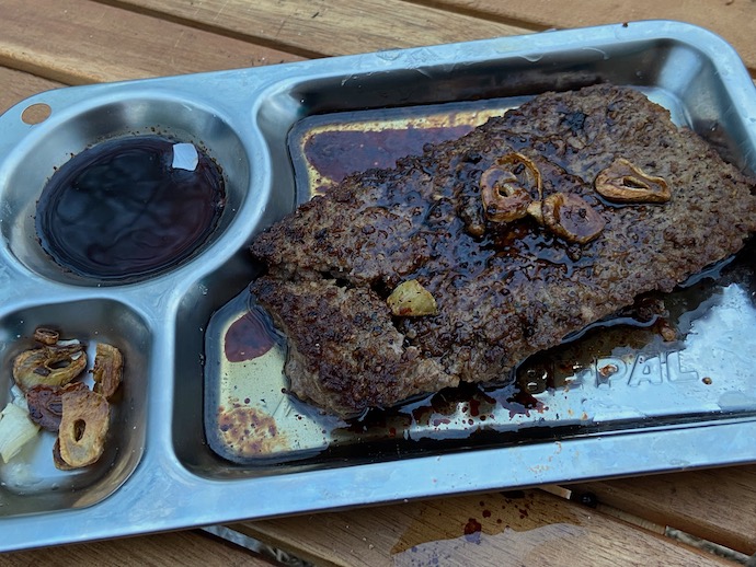どちらにしても、肉で腹がいっぱいになる膨満感というか飽食感がお手軽に得られるのは間違いない。この脂身たっぷりのひき肉を食べ切ると、米の飯の入る隙間はない。この肉を焼きながらメスティンで炊いていたくるみご飯は、そっくり次の日の朝食へと先送りされた。肉を食いすぎて、当分は肉料理はいらないなと思う程には満足した。