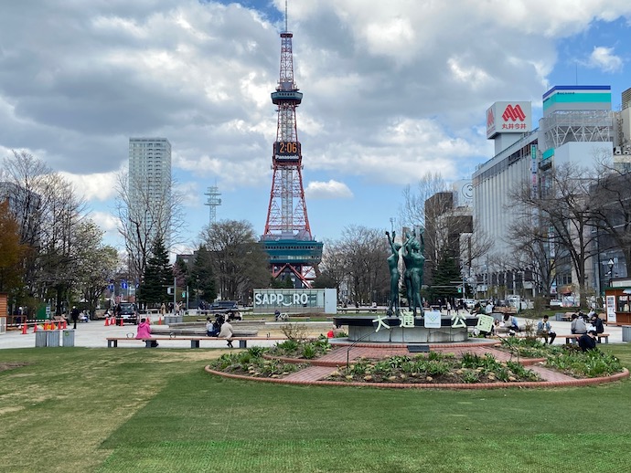 ベタな写真だが、札幌大通り公園の景色だ。相変わらず札幌の空は曇っていることが多いが、雪も溶けようやく遅い春がやってきたという感じがする。空気はとてつもなく冷え込んでいて、これでも春かと言いたくなるのだが、街のあちこちでは桜が咲き始めていた。