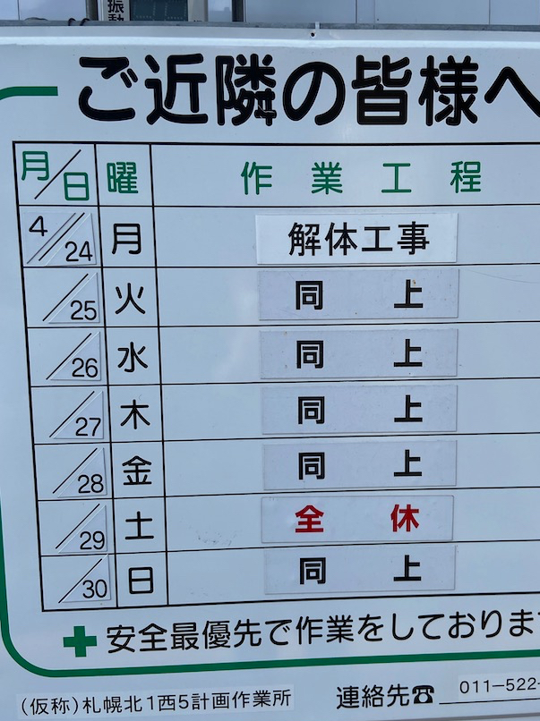 ニョキニョキと伸びていった高層ビルが、みるみる縮んで行くという都市伝説的な風景らしい。たまたま現場近くを通りかかり発見した解体工事の看板を見ると、面白いのが「このペナルティー解体工事」も週休二日制厳守らしい。おそらく解体工事監督のおやすみ日なのだろう。ペナルティーをくらった後の解体工事で、ブラックな労働環境にすることはできないだろうし。