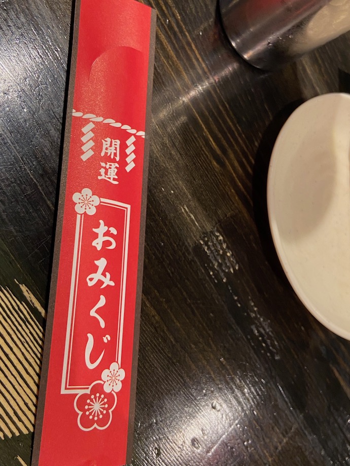 いつものようにおみくじ付きの割り箸で運試しをする。大吉が出ると何かすごいサービスが受けられると言われ続けているが、一度も大吉が出たことがない。よほど運が悪いのかとも思うが、まさか店長の作戦ということもないだろう。少なくとも大吉が出て、とてつもないサービスを堪能するまでは通い続けるしかない。