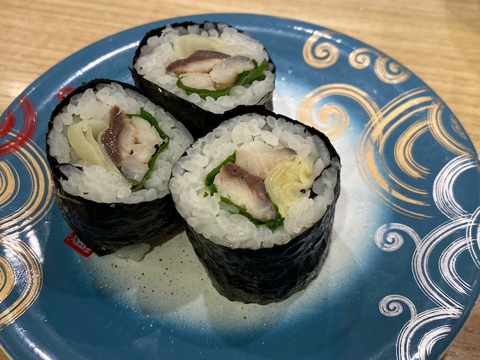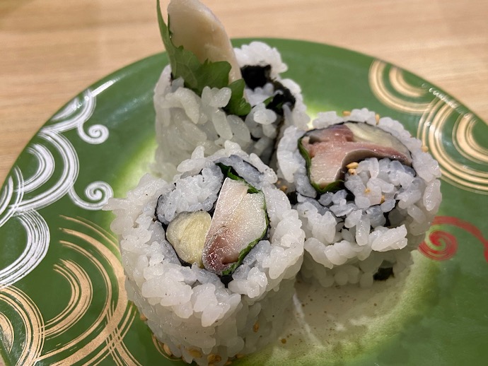 そのあとは、サバの巻き寿司を注文する。いつもであれば最低2皿は注文する、これまた我が絶対定番ネタなのだが、今回は一皿だけにした。こちらも、大衆ネタだったはずの鯖系鮨が高級ネタに昇格して値上がりしていた。ちょっと悲しい。