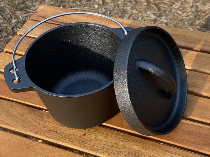 標準的なダッチオーブンは大小二個持っているが、当然ながらどちらも直径25cm程度の大型鍋で、重さも数kgあるからキャンプ道具としては重装備な代物に入る。車で行く時には特に問題はないが、焚き火で調理しようとすると周辺道具も必要で、やはり大掛かりなお道具になってしまう。その点、この超小型版はまさにおひとり様向けの大きさで実に良い。