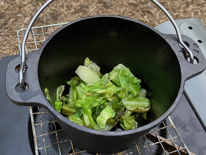これで準備作業が完了する。慣れれば5分もかからない作業だ。一度シーズニングを済ませて仕舞えば、焚き火の中に突っ込んで加熱調理することもできる。ワイルド系が好みであれば、焚き火に直で突っ込んだ鍋で塊肉を焼き上げるのも良い。お手軽ローストビーフだ。