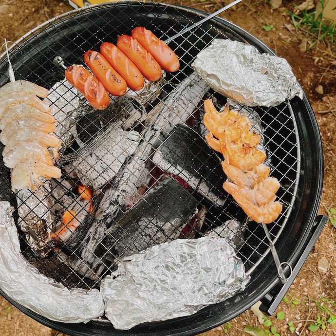 もう一つの名脇役がフランクフルトソーセージで、これも串に刺して焼けば、バーベキュー気分が一気に盛り上がる。みんな大好き、ソーセージだ。周りに並べているアルミフォイル包みの中は、かぼちゃとさつまいもで、さつまいもは地元埼玉産のベニはるかを選んだ。焼き芋にしやすいよう小ぶりのものを買ったのが正解で、肉よりも芋の人気が高いという、バーベキューあるある通りになった。